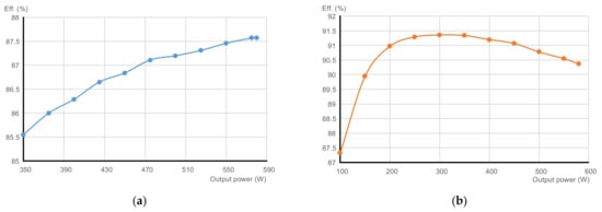 In Figure 12, the efficiency was measured on the various output power with a different operation mode. It can be seen that the efficiency operating on CV mode had better performance than CC mode at the same power output. Although the number of resonant elements on the secondary side seemed to be the same in the two output modes, the conduction group of the bidirectional switch also needs to be considered in the case of constant current output. Hence, the loss in CC mode was higher than the CV mode. Furthermore, according to Equations (9) and (14), a larger phase angle to achieve the same output power is required at CC output. At the condition of the 580 W output power, the corresponding phase angle operating in CC mode was about 104° and the efficiency was 87.6%, while the corresponding phase angle operating in CV mode was about 128° and the efficiency was 90.4%.