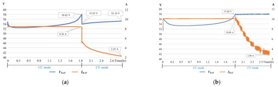 To investigate the difference between the IPT charger with and without closed-loop control, both experiments on the battery charging process were carried out and recorded. An open-loop-based result is shown in Figure 13a, where the charging voltage and current drop immediately caused by the change in the circuit configuration when the mode was converted from CC to CV mode. During the CV mode, the voltage instantly dropped to 53.93 V caused by the mode transition, and then slowly rose to 55.19 V due to the continuous charging of the battery. The difference in the voltage drift between the beginning and the end of the CV mode was about 1.3 V, which cannot meet the requirement of CV charging. In Figure 13b, the charging voltage of the closed-loop-based design can remain at a constant value of 57.8 V during the transient time from CC mode to CV mode. Compared with the open-loop-based design, the charging current can be maintained at a constant in CC mode and the charging voltage can be kept constantly in CV mode. On the other hand, the smooth conversion from CC mode to CV mode is unable to be achieved under open-loop control.