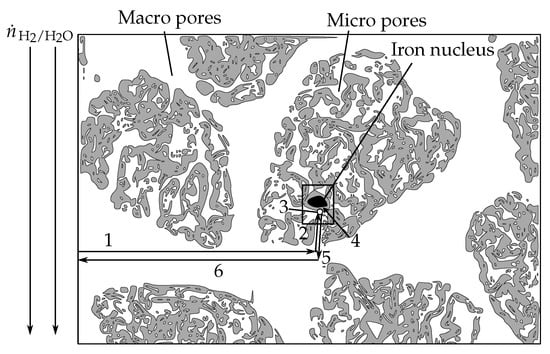 Schematic representation of the reduction process: (1) Diffusion of H2 through the macro pores; (2) Diffusion of H2 through the micro pores; (3) Chemical reaction; (4) Movement of the iron cations Fe and electrons to the iron core; (5) Diffusion of H2O through micro pores; (6) Diffusion of H2O through macro pores (inspired by [32]).