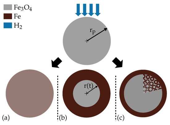 For modelling the structural change of the reaction mass inside the pellet depending on the reaction progress of the heterogeneous, non-catalytic redox reaction, various models can be found in the literature [17,37,44]. Among these models, it can be distinguished between porous and non-porous reaction solid models. Depending on the structural model used, some of these functional mechanisms are applied or even combined, which implies the selection of the appropriate initial and boundary conditions for Equation (7). To formulate an adequate model for describing the complex structure and, consequently, the behavior of the iron oxide pellet during the reaction, the following assumptions deem necessary: