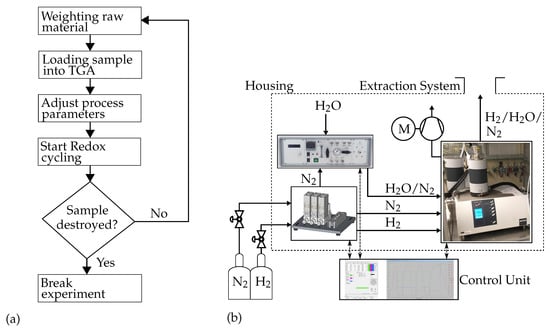 (a) Flowchart for the experimental procedure; (b) TGA setup for the experimental investigation of the kinetics of the redox reactions.