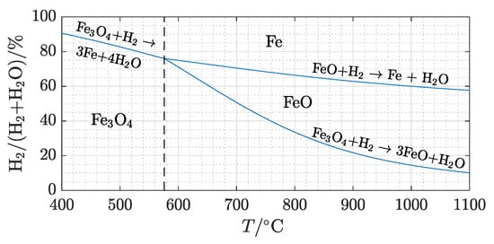 At the beginning of the 20th century, the fundamentals of the iron redox process were used for the production of hydrogen, whereby the process was also given the name “steam–iron process” [12,13]. Nowadays, the reduction of iron oxide is mainly used in iron production [14,15]. Within the so-called direct reduction process, iron ore is reduced to metallic iron by means of a H2/CO gas mixture. In view of the high economic importance of iron, the reduction behavior of iron oxides is a frequently studied topic in ferrous metallurgy [14,15,16].