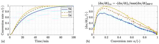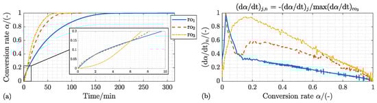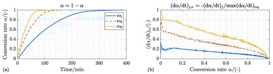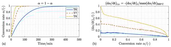 In order to investigate the influences of the different reaction conditions, a number of independent algebraic equations have been presented in the literature, which are useful for describing the process within a certain range of reaction conditions [40,54,55,56,57]. The basis for this is the general description of the solid-state reaction rate: