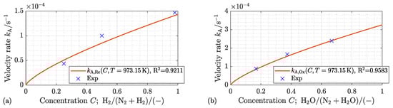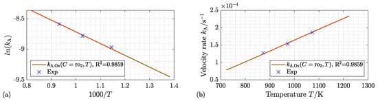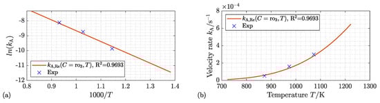 with as the reacted fraction at time t, as the activation energy, A as a pre-exponential factor of the Arrhenius relationship, and T as the absolute temperature. In addition, the reaction gas concentration C appears, which is raised to an empirical exponent n [58,59,60], which has to be determined by fitting the experimental data to Equation (35).