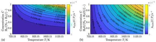 The diffusive mass transport of the reactants can be expressed by the vector of the diffusive mass flow density, which is mathematically and physically defined as the product of the molecular diffusion coefficient and the vector of the concentration gradients of the species j , which is also called the 1st Fick’s law of diffusion [37]. Moreover, since the inflowing and outflowing mole streams are the same (4 moles of H2 against 4 moles of H2O as described by Equation (2)), the convection term can be neglected. The mass of species j formed by the chemical reaction in the balance volume is described by the rate of change of the mass .