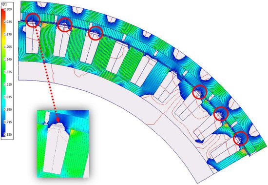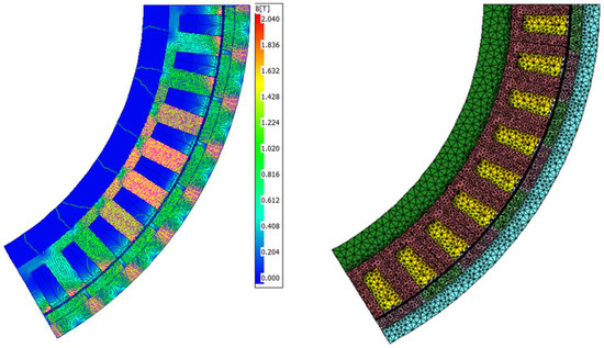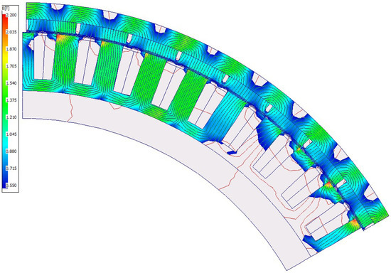 Calculated motor magnetic induction distribution without the axial segmentation of the magnets, in the 847th second of the Artemis Motorway150 cycle time with the operating parameters: vvehicle = 150.4 km/h; n = 1140 rpm; Tm = 596 Nm; IRMS = 92.26 A, αphase advance = 20.5°).