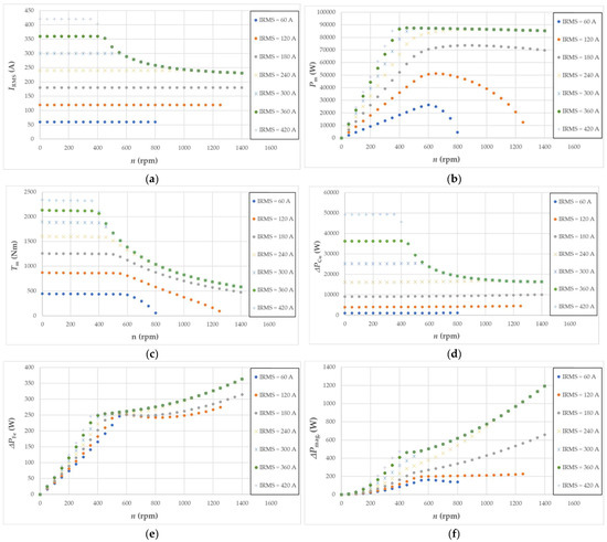 In Figure 5a,c, it can be seen that the maximum supply current corresponds to the maximum torque only in the zone without flux weakening (MTPA control). In the zone with flux weakening, increasing the rotational speed, while maintaining the voltage limited by the DC bus, is accomplished by a space vector along the d-axis of the current, which generates a flux in the opposite direction to the flux produced by permanent magnets. In the MTPV control, the possible maximum torque is obtained at a current lower than the maximum current, which has a positive effect on the efficiency of the motor and reduces winding (Figure 5d). For currents, IRMS = 240 A, IRMS = 300 A, IRMS = 360 A and IRMS = 420 at higher rotational speed the torque and losses in the machine have the same value, because all currents are within the limits of voltage elipse and current circle defined for MTPV control (Figure 5c–f) [44]. At higher rotational speeds, the torque drops much more smoothly than in the FW control (Figure 5c). For the values of the supply currents IRMS = 60 A, IRMS = 120 A and IRMS = 180A (Figure 5c) there is an FW control, where at a constant value of the RMS current, the share of the space vector of the current in the d axis of the motor increases, which results in an increasing weakening of the flux from permanent magnets and decreases losses in the machine. This results in an almost linear decrease of the torque, the decrease of the torque in such control, at higher rotational speeds, is much more visible than in the MTPV control. With insufficiently high RMS current values (60 A and 120 A supply current), it is impossible to achieve the maximum rotational speed and at the same time generate the appropriate torque, due to the too- high value of the current component in the d-axis in relation to the current component in the q axis of the motor.