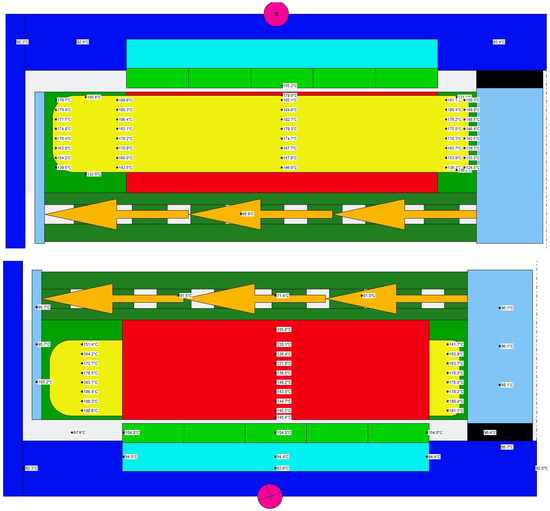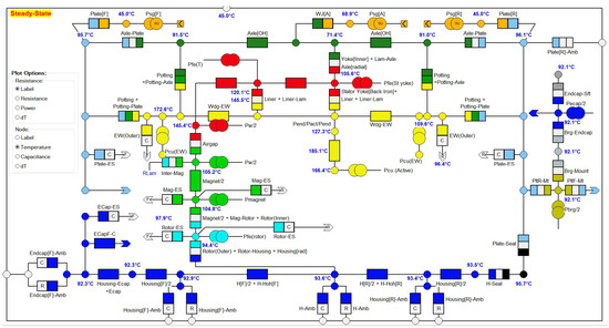 In the Ansys Motor-CAD program, a thermal motor model has been developed. Figure 6 shows a simplified equivalent thermal diagram of the motor. The thermal schema method is commonly known and commonly used in calculating electrical machines [49,50,51]. The program also enables the analysis of slot cross-sections on simplified FEM models in order to calibrate the network of the model.