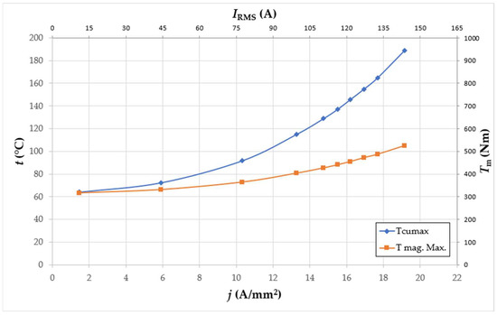 Figure 7 shows the temperature characteristics of winding (hotspot) and magnet, calculated in the ANSYS Motr-CAD program as a function of the supply current. The calculated points of the torque correspond to the points on the calculated temperature characteristic. The calculated characteristics show that when supplied with IRMS = 130 A (current density j = 19.2 A/mm2) and the assumed operation S1, the motor produces a torque equal to Tm = 902 N m. At this operating point, the maximum temperature in the winding is set at TCu = 189 °C, while the temperature of permanent magnets is set at Tmag. = 105 °C.