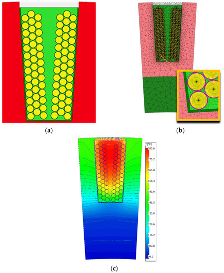 Machine winding of the coils allows for a large filling of the slot (and a very good adjustment of the winding wire distribution in the coil). During manual winding, especially in the case where the motor is wound with a bundle of parallel wires, obtaining a large slot filling is limited, because the wires in the slot are arranged randomly, twist, and cross. It also has a negative impact on the thermal performance of the motor, because the interlacing causes the free space in the slot between the coil and the stator magnetic core, which is the path of heat dissipation from the winding to the cooling system, to be filled with air, impregnation and/or epoxy resin in places. These are spaces where thermal conductivity is much lower than copper conductivity. Figure 9 shows a cross-section of the slot model with the location of the wires in the single coil and the calculated temperature distribution in the slot for the operating point Tm = 902 Nm and speed n = 400 rpm. From the calculated temperature distribution of the winding in the slot, the maximum temperature is TCu max. = 183.1 °C, mean temperature TCu av. = 167.3 °C, while the minimum temperature TCu min. = 133.1 °C. The calculated temperatures on the schematic model (Figure 8) are analogically TCu max. = 185.4 °C, TCu av. = 165.8 °C, TCu min. = 127.4 °C. The results of calculations using both methods are similar with satisfactory accuracy.