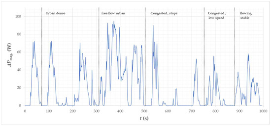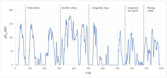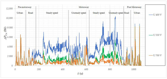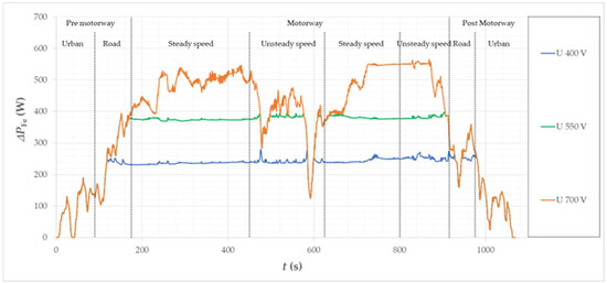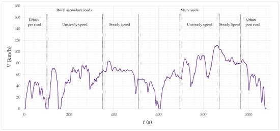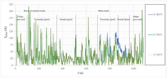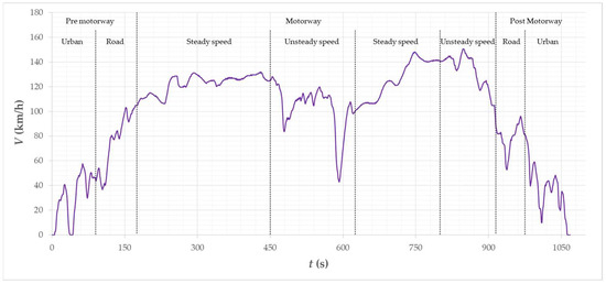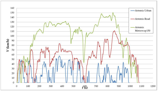 Figure 10 shows the vehicle speed for the three driving cycles considered in the further analysis: Artemis Urban, Artemis Motorway150, and Artemis Road.