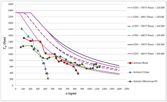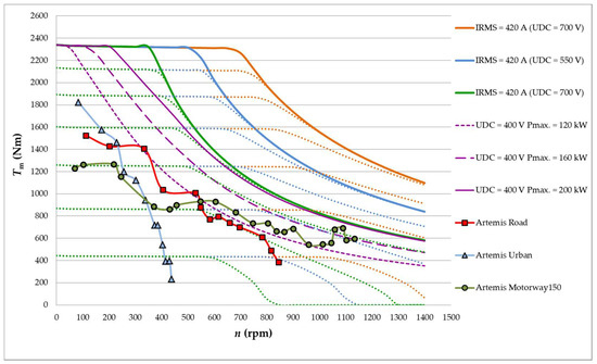 Figure 12 provides the basis for the further analysis of motor performance conducted in this article. The figure shows the family of motor characteristics, calculated for the battery voltage UN = 400 V (green color), analogous to the characteristics shown in Figure 5. The characteristics are marked with points representing the highest torque of individual driving cycles. The highest torque of approx. Tm = 1800 Nm is required for the Artemis Urban cycle at low speeds of up to approx. n = 100 rpm. The entire urban cycle is confined to the first torque control zone.