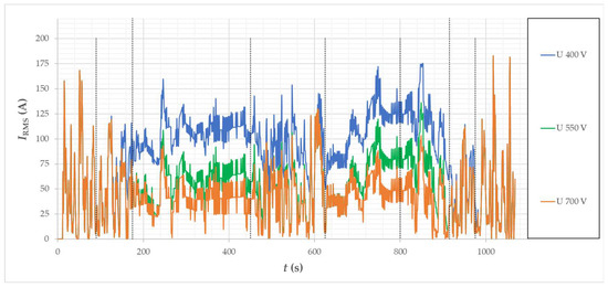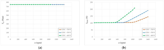 The following graphs, shown in Figure 13 the calculation results for the three voltages under consideration. The calculated characteristics relate to the calculations for a constant torque Tm = 750 Nm in the speed range from n = 0 rpm to n = 1400 rpm.