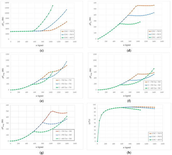 Figure 13a shows the torque characteristics as a function of rotational speed, calculated for the constant temperature of the winding and permanent magnets. For the voltage UDC = 400 V, the torque Tm = 750 Nm cannot be achieved in the full range of rotational speeds (the torque is achieved up to a speed of n = 1050 rpm). For the voltage UDC = 550 V and UDC = 700 V, the considered torque is achieved in the entire rotational speed range, up to n = 1400 rpm. Figure 13b shows the IRMS current waveform for various UDC supply voltages. The figure shows at what rotational speed, depending on the supply voltage, it is necessary to flux weakening the motor to be able to work with the torque Tm = 750 Nm (the current value increases). Similarly, the power losses in the winding increase in Figure 13c. Figure 13d shows the calculated power losses in the stator magnetic core. While the losses in the winding increase with the increase of the supply current, the losses in the magnetic core decrease. This is due to the flux weakening process, which lowers the value of the magnetic induction in the magnetic core, thus lowering the value of power losses. Figure 13e–g shows the power losses in permanent magnets. As in the case of the losses in the stator magnetic core, also in magnets, flux weakening lowers the losses in the magnets, while the effect is limited and decreases with increasing flux weakening and current intensity, which is visible when comparing the loss waveorms for two different to request. Figure 13f,g show that for a torque smaller than Tm = 550 Nm and Tm′ = 300 Nm, the rotational speed range in which the power losses generated in the magnets are lower when powered by a lower voltage (UDC = 400 V) is wider. It can be concluded that the use of a higher supply voltage will significantly reduce the power losses in the motor winding during operation in the flux weakening region, it will also reduce the power losses in the magnetic core of the motor (also only in the flux weakening region), while in the case of losses in permanent magnets, a reduction in these losses can also be expected. It should be noted that the analysis concerns the calculation of the cases of all three voltages for the same operating temperatures (TCu = 113 °C and Tmag. = 84 °C). The losses generated in the magnets depend on the excitation, which in turn depends on the operating temperature of the magnets, which is influenced by the temperature of other elements, mainly the winding and the magnetic core.