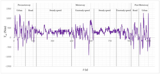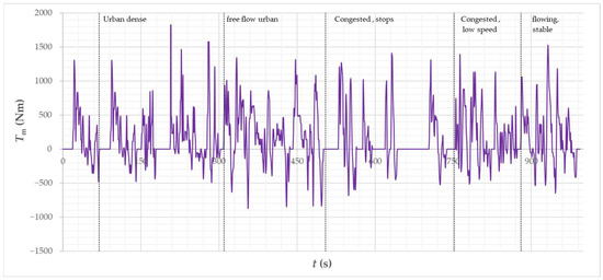 Then, the envelope of maximum torque as a function of rotational speed was determined (Figure 12). The maximum torques at various rotational speeds are the torques that the motor must generate to obtain the required acceleration in a given driving cycle