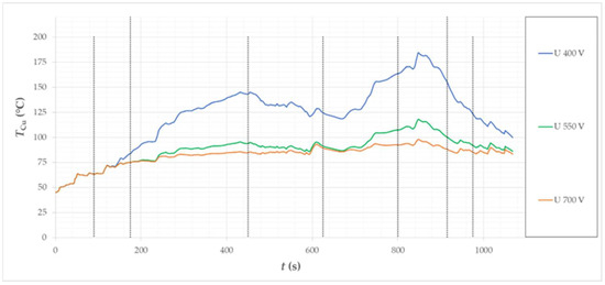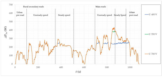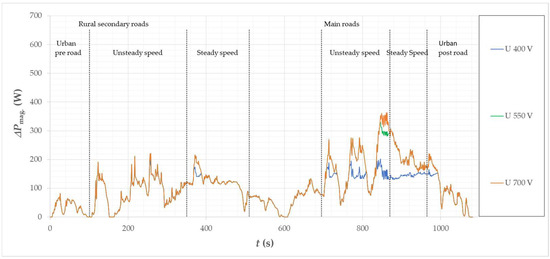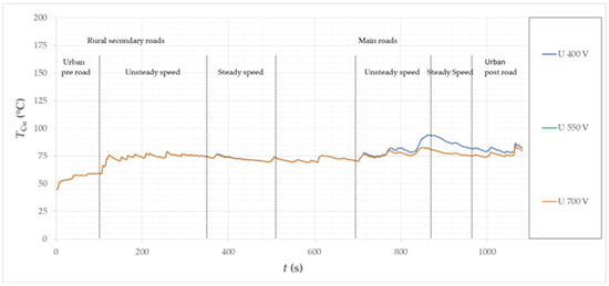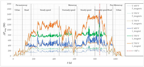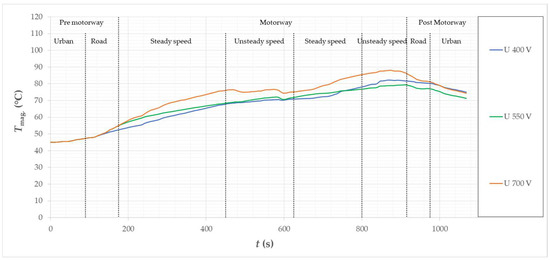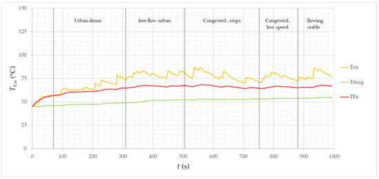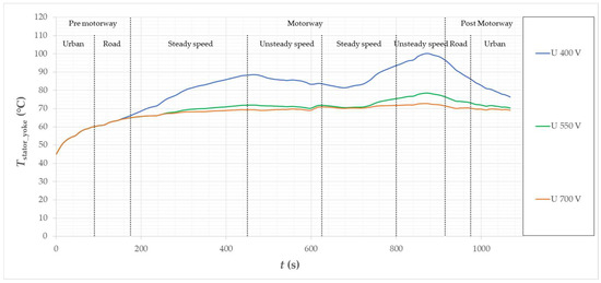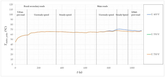 In the case of driving on the highway, the achieved operating temperatures of the winding, when supplied with voltage UDC = 400 V, are much higher, equal to or close to the maximum permissible. The temperature of the magnets remains at a safe level, as is the temperature of the magnetic core yoke (depending on the manufacturing technology and the pressing of the laminated stack/core/package onto the supporting structure). The high operating temperatures of the winding are caused by the necessity of a fairly deep flux weakening of the motor and the related increase of the motor supply current. Increasing the supply voltage causes the operating range in the second control zone to decrease so that the winding temperature is within safe limits. The higher the supply voltage, the lower the winding operating temperature in the motorway cycle. Increasing the supply voltage even to the value of UDC = 700 V and a very large reduction in the flux weakening zone resulted in an increase in the power generated in the magnets, but it did not increase the operating temperature of the magnets to a dangerous value.