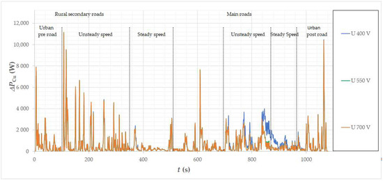 From the waveforms presented in Figure 12, it can be concluded that for the limitation of the supply power to PIN = 120 kW, the urban driving cycle can be achieved, while for the on-road cycle, the power supply is insufficient at two points, which means that the assumed driving dynamics is not maintained. For such a power limitation, the Highway cycle is even less feasible. Similarly, increasing the allowable power supply of motors to PIN = 160 kW will enable the achievement of the required torques for the road cycle, and increasing the power to PIN = 200 kW will also cover the motorway cycle, although with a small reserve of power at the highest rotational speeds.