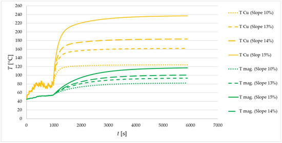 From the presented calculation results, it can be concluded that the drive system of two-wheel hub motors ensures safe, constant driving at a speed of v = 50 km/h on a road with a 13% gradient. The winding temperature is set at approx. TCu = 160 °C. The temperature of the magnets under these operating conditions is set at approx. Tmag. = 95 °C. Both temperatures are safe for long-term operation. With a slope of the route at the level of 15%, the temperature TCu = 160 °C is reached after t = 150 s, while TCu = 200 °C was reached after t = 385 s. It can be concluded that such motor overload is permissible not permanently but until t = 385 s, which corresponds to covering the distance m = 5.34 km. Under this assumption, the temperature of the magnet will not exceed the allowable temperature.