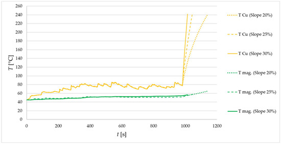 Calculated temperature waveforms of the winding and magnets while driving the car at a speed of v = 50 km/h, on the road with different slopes.