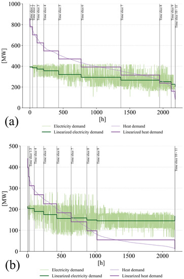 The case study used for demonstrating the functionalities of the proposed method was constructed based on an existing large-scale CHP system located in Poland. In an attempt to decrease the computational complexity of the problem, the annual thermal load of the CHP system was discretized into representative time slices. Discretizing duration curves of a full year is a well-established technique used in linear optimization models constructed for planning, designing, and controlling power and thermal energy systems [40]. In the current work, the yearly time series for heat and electricity were divided into quarters (also commonly referred to as duration curves) and each quarter into 11 bins, as shown in Figure 3. In addition, the annual variations in the heat demand for 2022–2040 were calculated using the method described in Section 2.1.