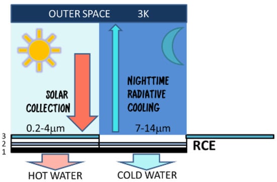 Combining both traditional solar collection during the day and cooling production during night-time, using exclusively renewable energy, has been proposed by several authors [8,9,10,11,12]. Vall et al. [10] presented for the first time a single device called a radiative collector and emitter (RCE), which combines solar heating and radiative cooling functionalities using an adaptive cover. Optical characteristics of this adaptive cover are different (almost opposite) for solar collection than for radiative cooling. While the solar collection requires a cover with high transmittance of radiation in 0.2–4 µm wavelengths and a low transmittance for the rest of wavelengths, the radiative cooling surface requires a high transmittance in the wavelength range between 7–14 µm (to radiate to the outer space through the atmospheric window). Moreover, the absorber/emitter surface used for both heating and cooling purposes should have a high absorptivity/emissivity in the full solar and infrared (IR) spectrum (broad-band emitter), in contrast to the selective or narrow-band surfaces used in conventional solar collectors and radiative coolers [13,14]. More recently, other researchers have also proposed this idea of producing both heating and cooling, but with other solutions [15,16], especially using spectrally selective materials used as radiative cooler emitters. Other studies focused on the combination of both strategies, selective covers, and emitters to achieve solar collection and night-time radiative cooling [17].