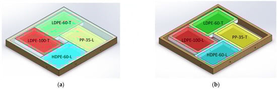 Plastic films were mounted in wood frames of 13 × 15 cm2 each (Figure 5). The bottom of the frames was painted black. To study the influence of the glass present in the RCE solar collection mode, two experimental sets of frames were mounted in parallel, one without glass and the other with glass. Samples were cut in a longitudinal (L) or transversal (T) direction according to the extrusion process, as shown in Figure 5, and samples were extracted after 90 days. An experimental campaign of three months was performed because authors observed in a previous experimental campaign an average transmittance drop of 0.7% for 500 μm PE exposed during two months in summer. According to this, the more significant transmissivity drop happens after the second month. In addition, Chabira et al. [32] show a dramatic drop after three months in both elongation at break and tensile strength for LDPE samples exposed 8 months to environmental conditions.