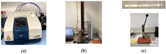 (a) Jasco FT-IR 6300; (b) ZwickRoell BZ1-MMZ2.5.ZW01; (c) 1 × 15 cm specimen and press.