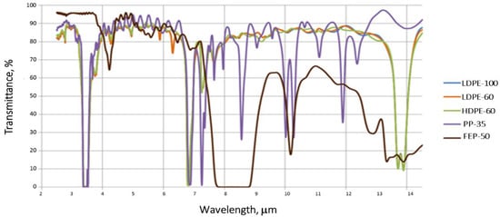 A decrease in the average transmittance in the atmospheric window between 3.5% and 6.5% for LDPE-100 and LDPE-60, respectively and 9% for HDPE was calculated. PP-35 shows the lowest decrease in transmittance, with a value of 3%.