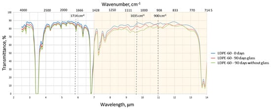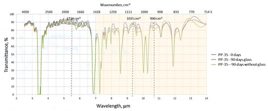 Finally, when analyzing Figure 11 for PP-35 it is seen that curves in the atmospheric window for 0 days and 90 days with glass are very similar and this result matches with the one presented in Table 3, where no significant differences were observed between these two samples. Curves for 0 days and 90 days without glass present slight differences. These differences are statistically significant according to Table 3, meaning that PP-35 suffers some degradation when it is not covered with glass. This is also corroborated by the absorption peak in 1714 cm−1 for 90 days without glass. Unlike what was seen with the other materials, no absorption peaks in the double bond (C=C) absorption band were observed for PP-35.