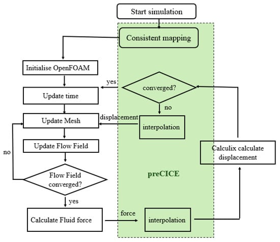 For the fWEC, a strong fluid–structure interaction (FSI) problem needs to be solved, and thus a fully coupled FSI tool is developed to solve such problems. In particular, the fluid field is solved by a high-fidelity CFD solver, while the deformation of flexible bodies is solved using the FEA method. For data exchange between the two solvers at each time step, an open-sourced coupling library for multi-physics simulations is used.