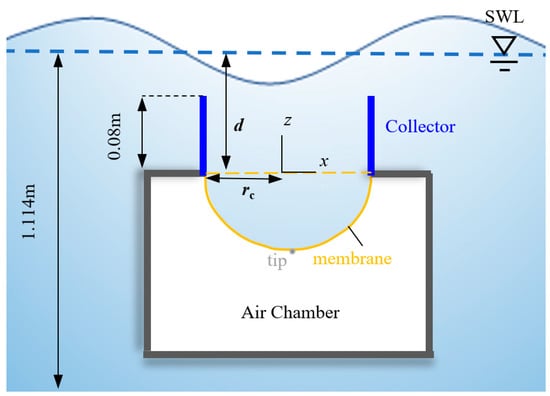 In our numerical study, the geometric dimensions of the above device were designed based on experimental research [], where the model was scaled down at a factor of 1:40/1:50. At the beginning, the membrane was unstretched with a radius of rc = 0.065 m, and its initial position is shown in Figure 2. Once it started deforming, we monitored the tip displacement of the membrane ztip, which was directly linked to energy conversion. The distance between the position of the unstretched membrane and the static water level (SWL) was defined as the water height d.
