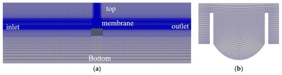 The mesh configuration is shown in Figure 3, with a cell numbers of around 68,000. As shown in Figure 3a,b, the mesh was refined near the free surface and inside the collector to better capture the wave profile and the flow details. The boundary condition of the membrane was set up as a non-slip wall boundary for the fluid velocity and a zero gradient for the pressure. The velocity and pressure at the inlet boundary were prescribed by regular wave theory, and both were set to be zero gradients at the outlet boundary.