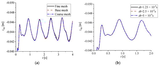 The independence study for the mesh and time step was tested for an fWEC with d = 0.18 m, H = 0.1 m, and T = 0.8 s. Figure 4 shows the time-dependent deformation of the membrane ztip with different mesh refinement and time steps. The surface mesh size of the base mesh was 1.25% of the characteristic length L (length of the membrane), which was 0.75% and 2% for the fine and coarse meshes, respectively. As indicated by Figure 4, the results from the base and fine mesh were very similar to each other, and therefore, the base mesh was selected to reduce the computational cost. As for the time step, there was no obvious difference observed. However, a large time step may cause the simulation to diverge. A comprising time step of 5 × 10−5 s was finally chosen for the rest of the simulation in this work.