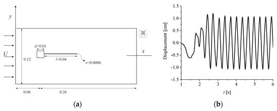 The first case consisted of a fixed square bluff body, behind which Von Karman vortex street shedding occurred and excited a periodic deformation of the elastic cantilever, as seen in Figure 5a. The typical parameters were a Reynolds number Re of 330, a mass ratio m* of 1.27, a non-dimensional bending stiffness K of 0.23, and Poisson’s ratio ν of 0.35. The predicted time-dependent displacement of the tip of the beam is shown in Figure 5b. The frequency was estimated to be 3.137 Hz, and the amplitude of the oscillation was 1.071 cm, which are consistent with the other results summarized in Table 1.