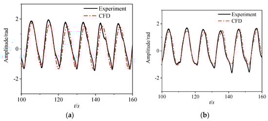 In the second case, a conventional rigid WEC was examined in our previous study, in which the numerical modeling of a wave–structure interaction problem was very well validated against the results from wave tank testing []. In this problem, the WEC was made up of four floats with rigid connections in between. The incident waves came from the left side (see Figure 6a), having a wave height of 1.5 m and a wave period between 9.5 s and 10.5 s. The CFD modeling results, in terms of pitch motion responses, were in very good agreement with the experiment (see Figure 7).