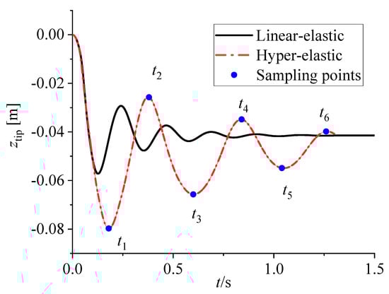 Figure 12a also indicates that the larger the added mass is, represented by larger d values, the smaller the fWEC’s structural natural frequency is. Given the same added mass, the fWEC with hyper-elastic material presented a wider range of natural frequencies than its counterpart with linear-elastic material. This is consistent with the classic natural frequency, defined as , where k is the stiffness and m is the mass. The tip displacement ztip’s dependence on d is plotted in Figure 12. This shows that a hyper-elastic fWEC is easier to deform than a linear-elastic material, especially at large d values.