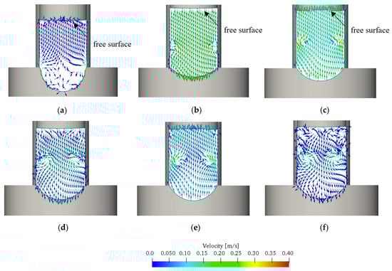 Development of the membrane deformation and the flow velocity vector inside the water chamber with a hyper-elastic material (d = 0.18 m): (a) t = t1, (b) t = t2, (c) t = t3, (d) t = t4, (e) t = t5, and (f) t = t6.