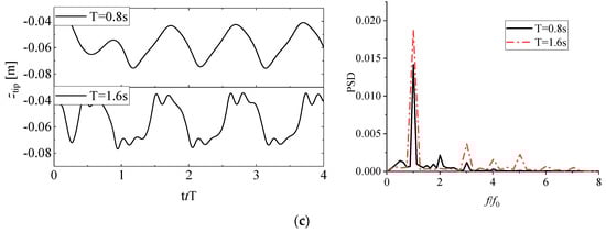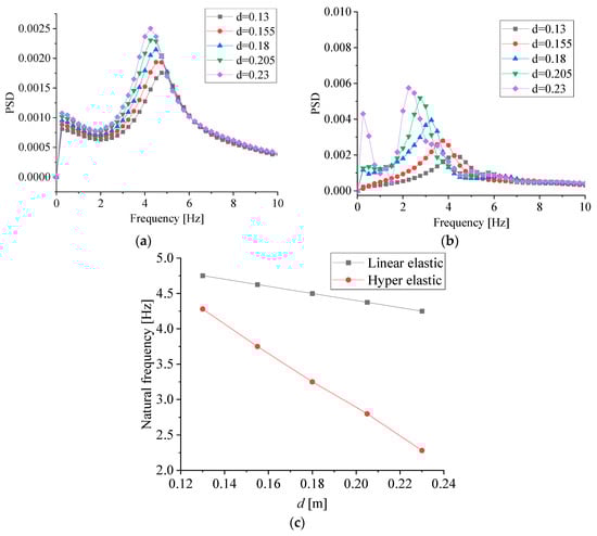 As mentioned earlier, the system’s natural frequency is dependent on the water column height d (i.e., the added mass of the fWEC), where a series of cases was tested with variable d values. The selection of d was based on the water height d0 and a wave amplitude A of 0.05 m in an experimental model [], resulting in a range of d = d0 ± A in this study. Figure 11a,b shows the FFT analysis distributions for the tip displacement with variable d values for a linear-elastic and a hyper-elastic material, and their quantitative values are plotted in Figure 11c. In Figure 11a,b, it can be seen that given the same range of d variation, the dominant frequency of a linear-elastic material system occurred at 4.5 Hz, while that for a hyper-elastic material system was spread out in a range from 2.25 to 4.25 Hz. In addition, a second-order low frequency was also excited with large d values. This might have been caused by the strong nonlinearity associated with large d values. All the natural frequencies of the fWEC were out of the range of the wave frequencies (f = 0.65–1.25 Hz), which will be further discussed in Section 3.5.