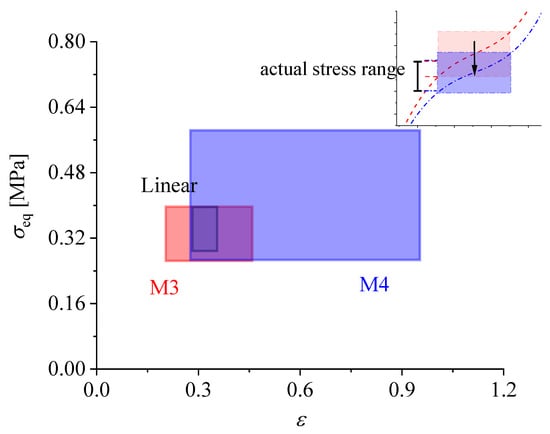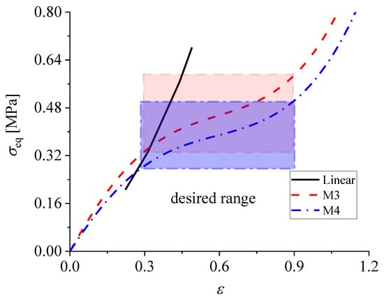 The stress–strain relationship of linear-elastic and hyper-elastic models M3 and M4, respectively.