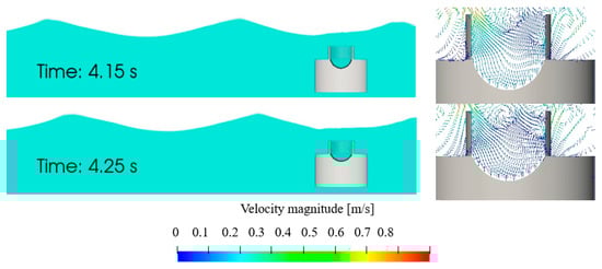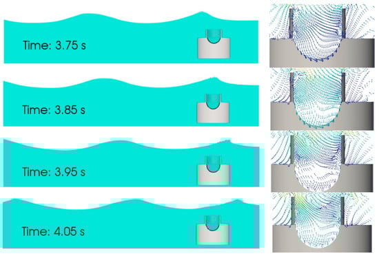 The internal flow field can be examined through the CFD results easily, and the vortex variation inside the collector is shown in Figure 21 and Figure 22 for T = 0.8 s and T = 1.6 s, respectively. With a wave period of T = 0.8 s, the clockwise and anti-clockwise vortices were generated alternately at the top left of the collector. The anti-clockwise vortex formed because of the backward flow caused by the propagating wave trough. This anti-clockwise vortex then moved downward over the fWEC, with waves passing from left to right. Meanwhile, the clockwise vortex formed due to the wave crest propagating into the water chamber. Only a clockwise vortex remained in the chamber. With a large wave period of T = 1.6 s, the clockwise vortex generated at the top left, and only part of the vortex went into the chamber. The vortex field was more chaotic than that of T = 0.8 s, and the anti-clockwise vortex remained inside. Meanwhile, the clockwise vortex generated at the top left of the chamber became larger. This contributed to the excitation of higher-order components, which partly explains why the wave with a larger period and with a smaller wave steepness showed higher nonlinearity.