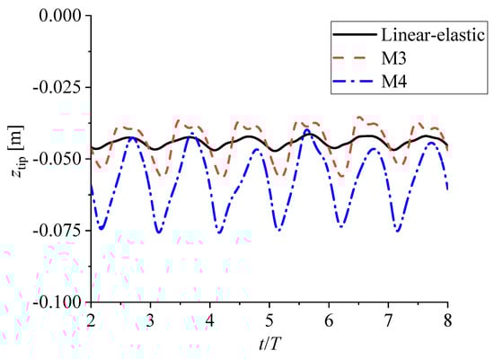 The time history of the tip displacements for the linear-elastic, hyper-elastic M3, and M4 materials is shown in Figure 15. For the linear-elastic membrane and hyper-elastic M3 membrane, their initial equilibrium positions (δstatic) were similar under hydrostatic pressure. When waves propagated, although all three oscillated periodically with the same period as the waves, the motion of the M4 material was the largest among the three. The typical amplitudes were 0.0025 m for the linear-elastic material but 0.01 m for M3 and 0.0156 m for M4.