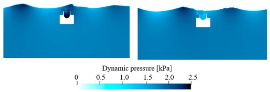 Figure 16 shows the dynamic pressure contour around the fWEC. It can be seen that the dynamic pressure reached its maximum and minimum at the crest and wave trough, respectively. Inside the water chamber, the pressure was much larger than outside with the wave crest passing. The opposite was true when the wave trough passed over.