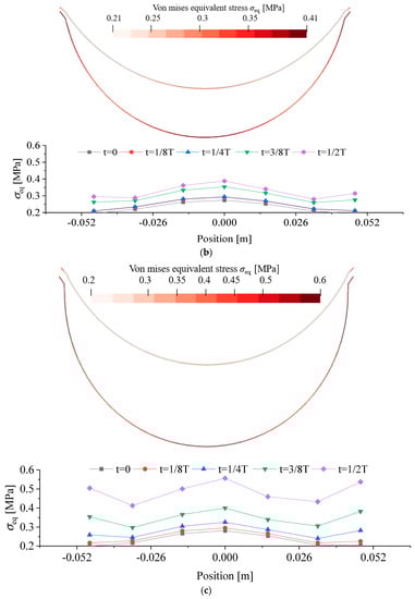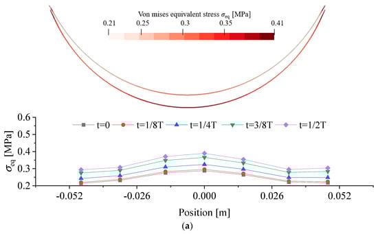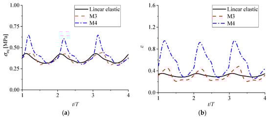 To better understand the membrane deformation in relation to the material stress induced by the hydrodynamic pressure, Figure 17 plots the instantaneous stress distribution along the membrane as well as the maximum and minimum membrane displacements. A comparison between the linear-elastic and a hyper-elastic M3 materials, displayed in Figure 17a,b, indicates that M3 had a larger deformation than the linear-elastic one, although their stress varied in the same range of σeq = 0.21–0.41. This observation highlights the superiority of using a hyper-elastic material over using a linear-elastic material if a large displacement is desirable. Again, this was proven by the much softer material of M4 shown in Figure 17c. The time-dependent stress and strain variation at the tip of the membrane is shown in Figure 18a and b. This confirms the above findings from Figure 17, with some additional information added on the appearance of nonlinearity of the material associated with the hyper-elastic material M4.