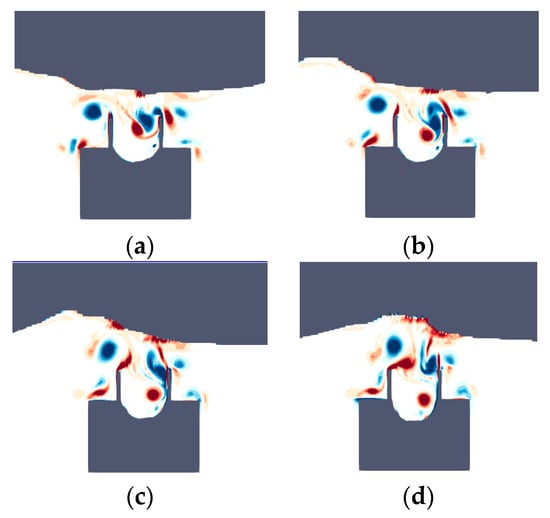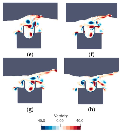 The instantaneous vorticity contour for T = 0.8 s in one wave period (H = 0.1 m and d = 0.18 m): (a) t = 1/8T, (b) t = 2/8T, (c) t = 3/8T, (d) t = 4/8T, (e) t = 5/8T, (f) t = 6/8T, (g) t = 7/8T, and (h) t = 8/8T.
