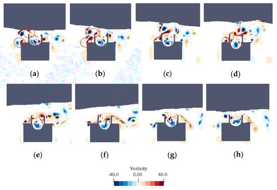 The instantaneous vorticity contour for T = 1.6 s in one wave period (H = 0.1 m and d = 0.18 m): (a) t = 1/8T, (b) t = 2/8T, (c) t = 3/8T, (d) t = 4/8T, (e) t = 5/8T, (f) t = 6/8T, (g) t = 7/8T, and (h) t = 8/8T.