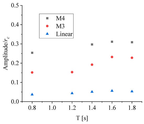 The effect of the wave periods on the fWEC is studied in this section with a constant d = 0.18 m. The wave height was fixed to 0.1 m. The wave periods from T = 0.8 s to T = 1.6 s were studied, which corresponded to the wave periods of 5.6–12.6 s at the device’s full-scale level. The time histories for the tip displacement of the membrane are presented in Figure 20 along with the Fast Fourier Transform (FFT) analysis. In general, large wave periods led to a more vigorous motion of the membrane, indicated by the large amplitudes. For the linear-elastic material, the curve appears to have a smooth variation though some nonlinearity features that can be observed when T increases. However, given a hyper-elastic material, significant differences can be seen for T = 0.8 s and T = 1.6 s. In fact, with a large wave period, the motion was more unstable, and wavelets at the wave trough and crest can be observed, implying higher-order components were excited, which is clearly illustrated by the FFT analysis. In particular, only the first- and second-order harmonic components were excited for the linear-elastic material, while for the hyper-elastic materials M3 and M4, a third-order and even higher-order components were added in, caused by the nonlinearity of the material’s mechanical characteristics.