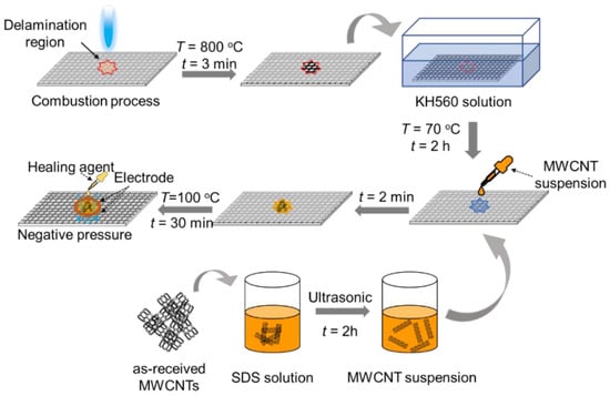 The MWCNTs, with an average diameter of 55 nm (Figure S1), are introduced on the CF surfaces in the repair process, as shown in Figure 1. The CFRPs fabricated via the vacuum-assisted resin infusion processing method [28] are pre-delaminated by a static compressive test using a universal testing machine (Instron 34TM-30, Instron Corporation, Canton, OH, USA). The spherical indenter with a diameter of 10, 20, and 30 mm compressed the panel along the thickness direction at a constant speed of 1 mm/min and stopped when its vertical displacement was up to 5 mm. We designed five delamination patterns (Mode I–V), the computed tomography (CT, YXLON FF35, YXLON International X-ray GmbH, Hamburg, Germany) of which in Figure 2 confirms the formation of delamination and its pattern dimension details in Table S1. It should be noted that the delaminated shapes produced by the static compressive process are spherical, resembling that of the indenters due to the slow loading speed [29]. The repair process of the delaminated CFRPs includes three steps: removing the resin via the thermal ablation process, coating MWCNTs on the CF’s surfaces, and polymer matrix re-construction. Avoiding disrupting the continuity of CFs as in the scarf and inject repairs [30], we utilized a controlled combustion process to remove the resins in the delaminated region at T = 800 °C for 3 min, during which the CFs could retain its structural integrity [31]. Then, the panel was immersed in the coupling agent, (3-glycidoxypropyl) trimethoxysilane, (KH560) solution at T = 70 °C for 30 min. The ablative region was subsequently infiltrated with the suspension containing dispersed MWCNTs assisted by the surfactant (sodium dodecyl sulfate, SDS) and the ultrasonic method. The wet panels were dried at T = 100 °C for 30 min for the final step of matrix re-construction. The healing agent—epoxy resin (TECHSTORM 481)—was injected in the ablative region assisted by a vacuum pump and cured at temperature T = 80 °C for 30 min. The heat for resin curing was generated by connecting the copper foil electrodes stuck around the ablative region at both the top and bottom surfaces with the electric power. The surface temperature was measured by an infrared thermograph camera (Hikvision H16, Hangzhou Hikvision Digital Technology Co., Ltd., Hangzhou, China).