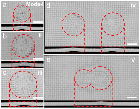 The CT images of the surface (upper) and cross-section (bottom) of delaminated panels with five different patterns: (a) Mode I; (b) Mode II; (c) mode III; (d) mode IV; (e) mode V. The dashed lines are guides to the eye. The delamination size and pattern shape in five modes are listed in Table S1. Scale bars are 10 mm.