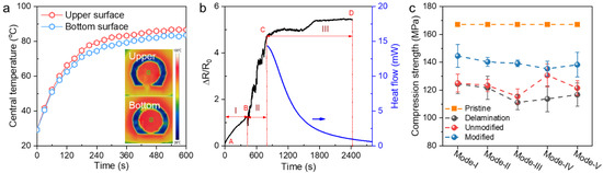 Monitoring the repair process. (a) The central temperature of the upper and bottom surfaces of repaired region with MWCNTs as a function of heating duration. (b) ∆R/R0 of upper surface of MWCNT-modified CFRPs as the healing agent was injected into the repair region. (c) The compression strength of delaminated CFRPs (mode I, II, III, IV, and V) and corresponding repaired CFRPs with and without MWCNTs.