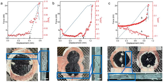 In order to elucidate the failure origins when the CFRPs are subjected to the compression force, we performed the compression tests on repaired CFRPs with different delamination patterns and monitored their structural changes by MWCNTs-based interfacial-damage sensors in Figure 4. The upper panels in Figure 4 show the force-displacement curves along with the corresponding ΔR/R0 during compression tests for CFRPs with a single circular pattern (mode III, Figure 4a) and two circles being either merged (mode V, Figure 4b) or separated (mode IV, Figure 4c). For all three of the repaired CFRPs, the force linearly increases with displacement until the panel failure occurs, which leads to the force abruptly dropping to zero. The maximum load is almost the same between three repaired panels, while the fracture displacement of mode III is half of that of modes IV and V, suggesting that damage accumulation is much faster in mode III. In contrast to the linearity of load, the ∆R/R0 of panels with one delamination pattern (mode III and mode V) exhibits the distinct two-stage evolution, that is, the ∆R/R0 is almost constant in the first stage and then it sharply increases with displacement until the materials fail. For CFRP with two separated delaminated patterns (mode IV), we measured the ∆R/R0 of each pattern (named A and B) independently, which shows distinctly different changes with displacement. The ∆R/R0 of A shows a two-stage transition, while ∆R/R0 in B continuously decreases with displacement. In the first stage, the steady or slowly increasing ∆R/R0 is expected, which results from the collaborative effect of the denser MWCNTs under compression and the tunneling effect from the deformation. In the second stage, the significant increase in ∆R/R0 signifies the formation of cracks and its fast propagation, leading to failure. For mode IV, the ∆R/R0 transition in pattern B indicates the damage occurring in this region that causes the failure of CFRP, while the decrease in ∆R/R0 of pattern A results from the denser locally connected MWCTNs network in which the structure remains intact. The corresponding front and side images of specimens after compressive tests are shown in the lower panels. We found that the fiber rupture in three modes mostly occurs along the thickness direction and belongs to the shear failure. The failure cracks appear at the boundary of the repaired region, suggesting the brittleness and the weak bonding between the repaired region and the pristine panel. Given that the change of resistance is determined by the connectivity of the interfacial MWCNT network, the proposed monitoring approach shows advantages in monitoring the delamination occurring at the interface, while the damages that do not affect the MWCNTs cannot be sensed.